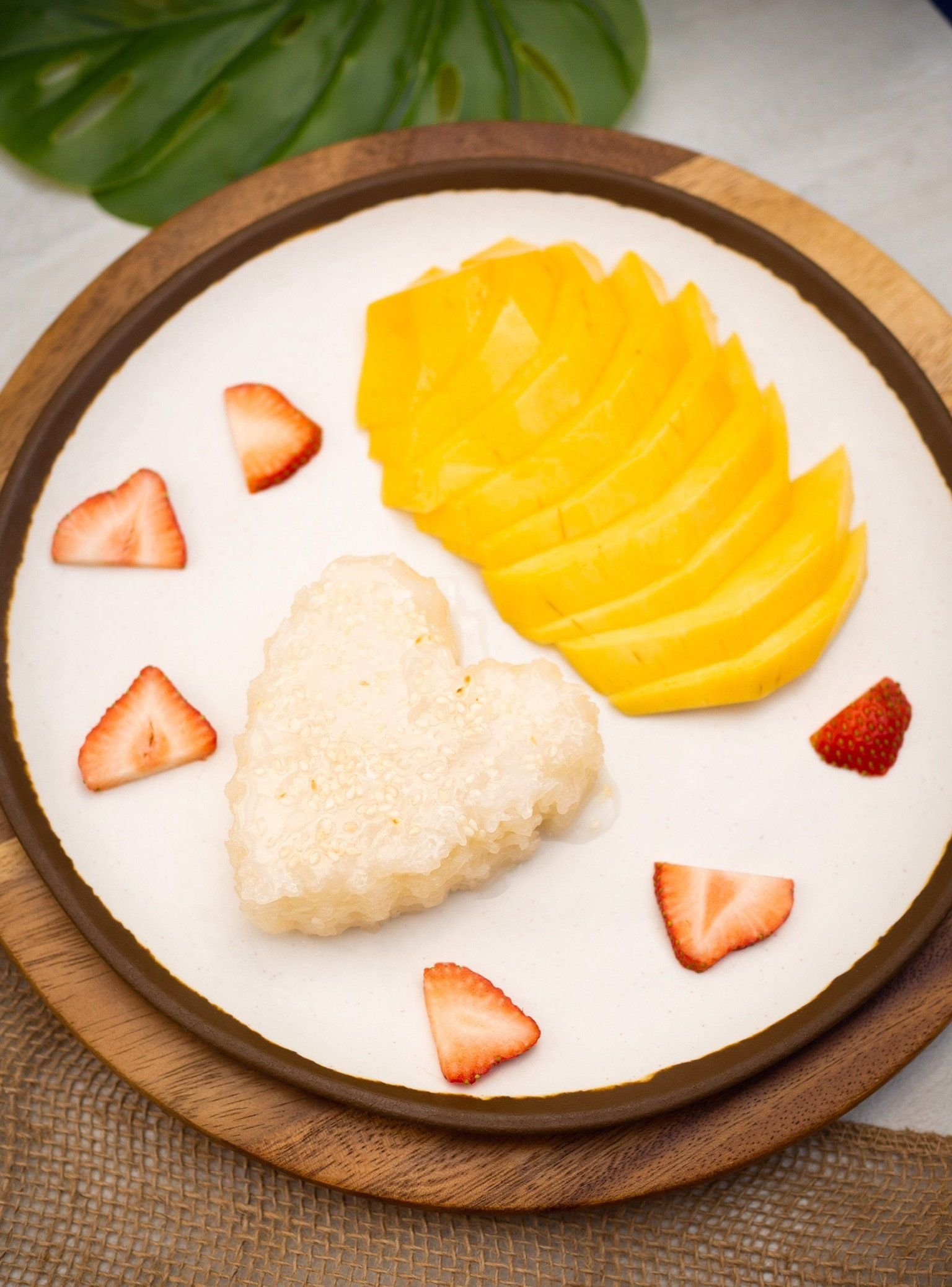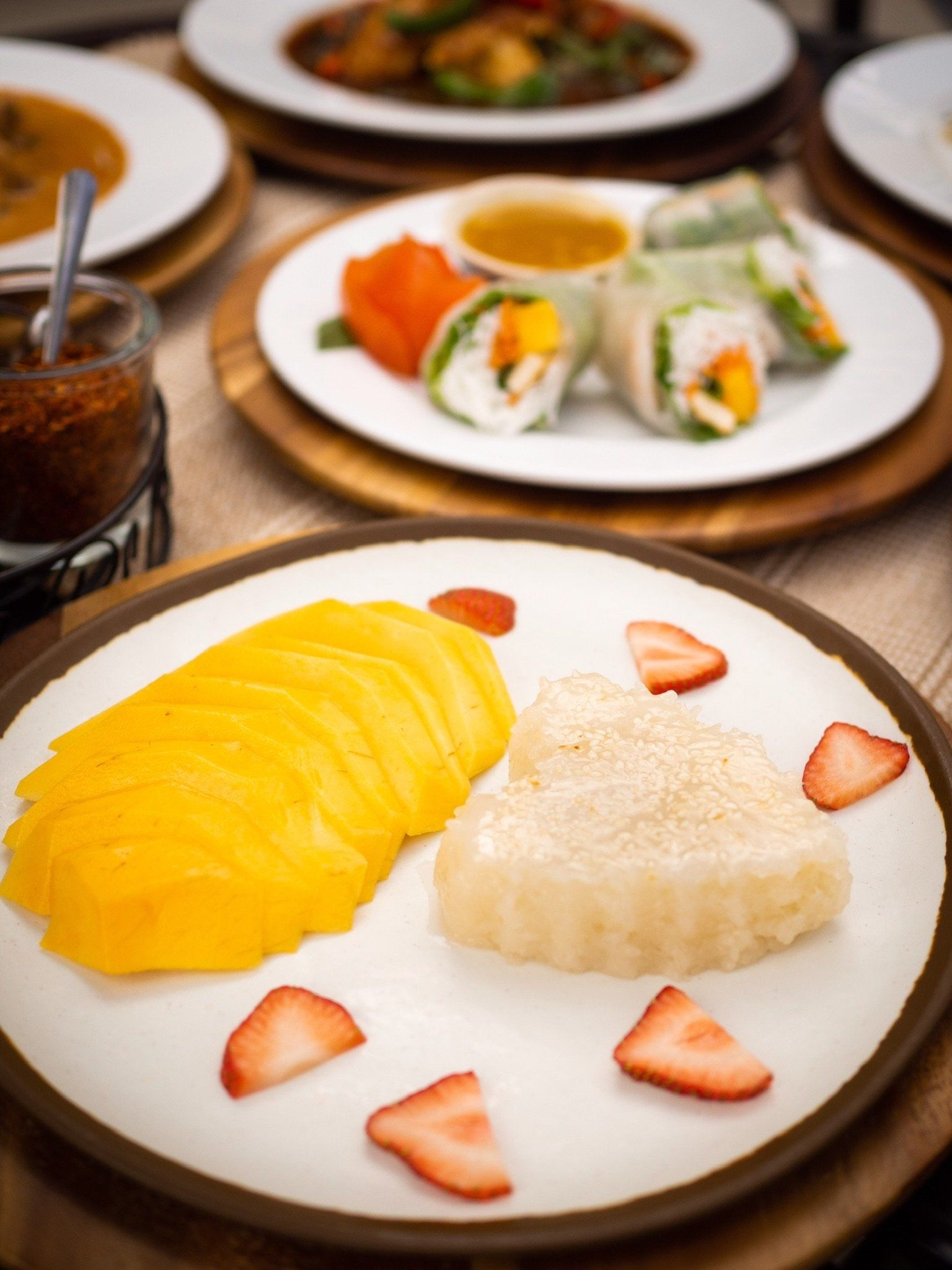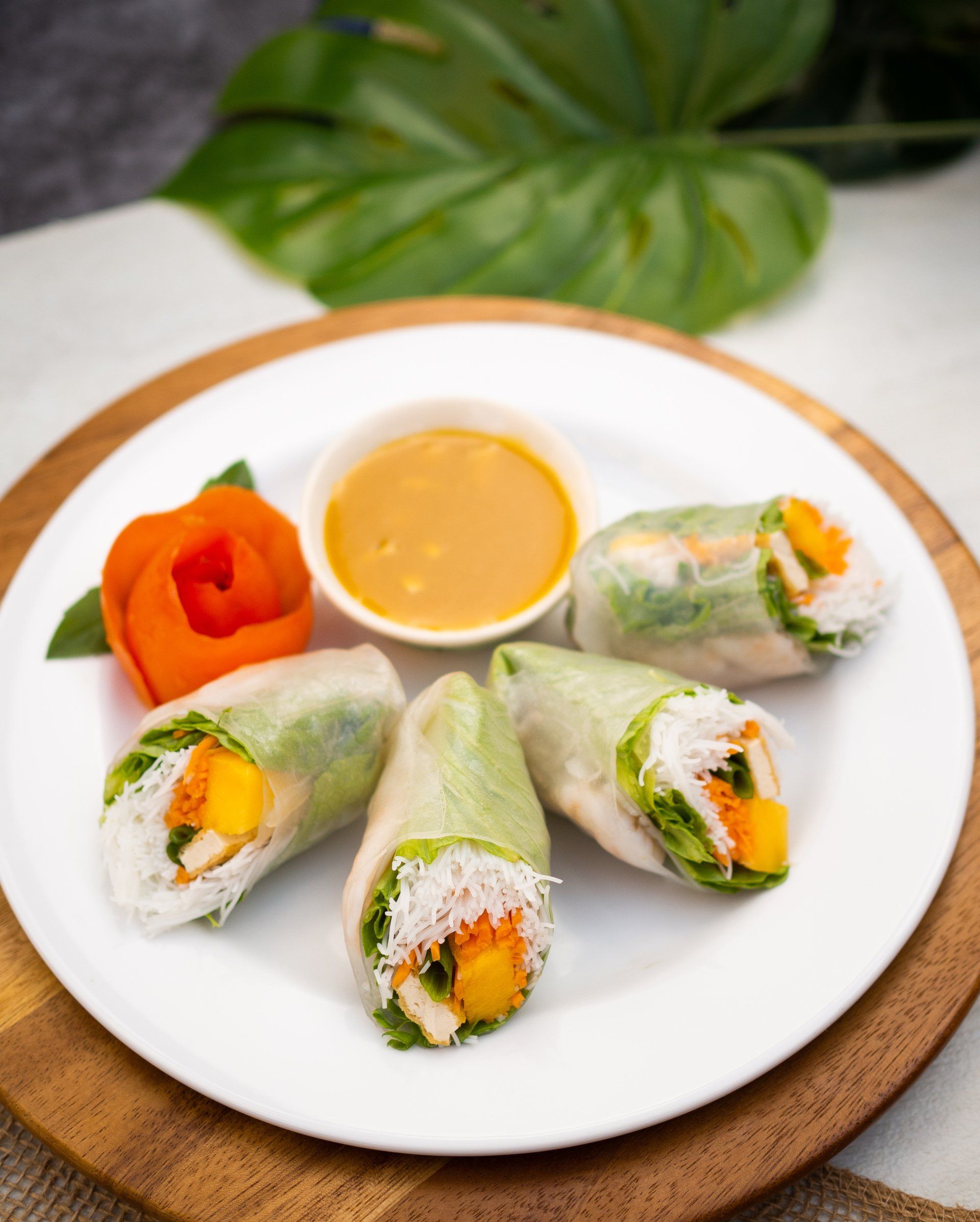 Cold rice paper rolled with noodles, mango, cucumber, asparagus, tofu, and basil.
