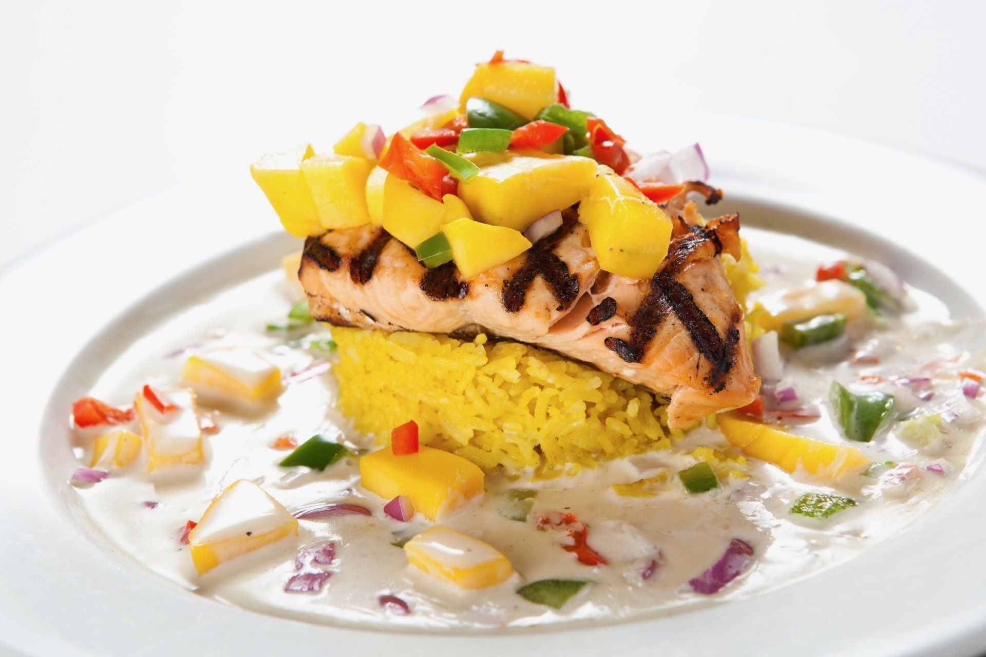 Grilled salmon drizzled with cream sauce on a bed of coconut rice, topped off with fresh mango and bell pepper salsa