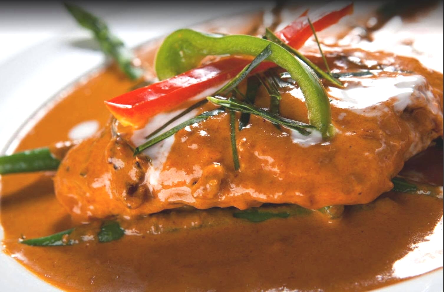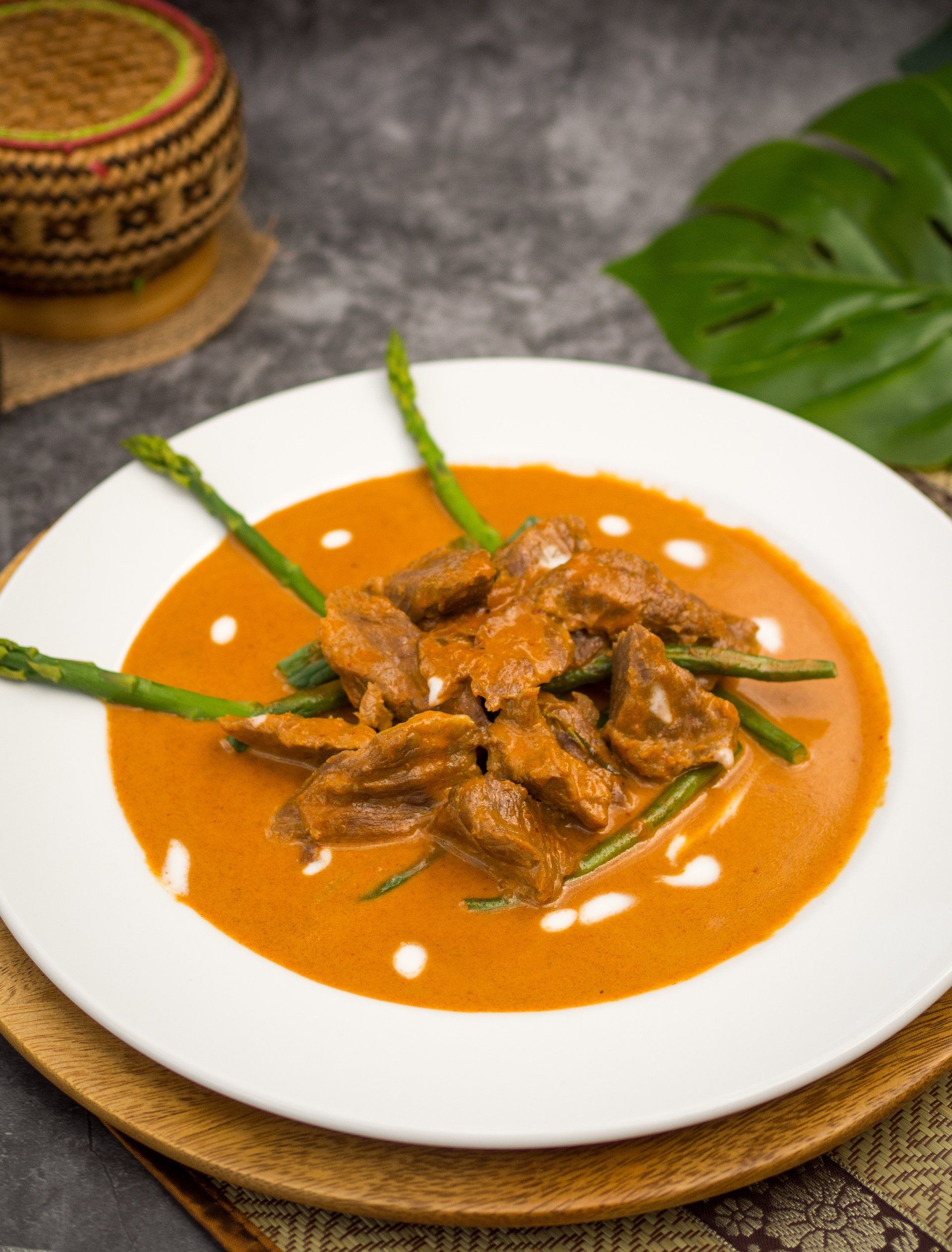 Flank steak simmered in our coconut Panang curry served on a bed of green beans and asparagus, topped with coconut milk