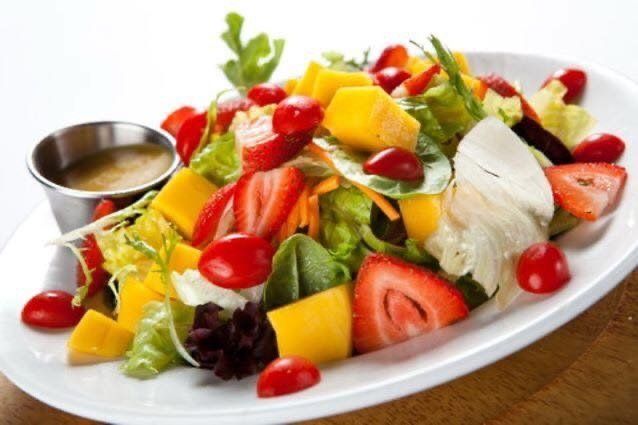 Crispy iceberg lettuce, spinach, carrots, baby greens, purple cabbage, seasonal fruits, tomatoes, and cucumbers. Choice of Grapefruit- Ginger or Honey mustard dressing.
