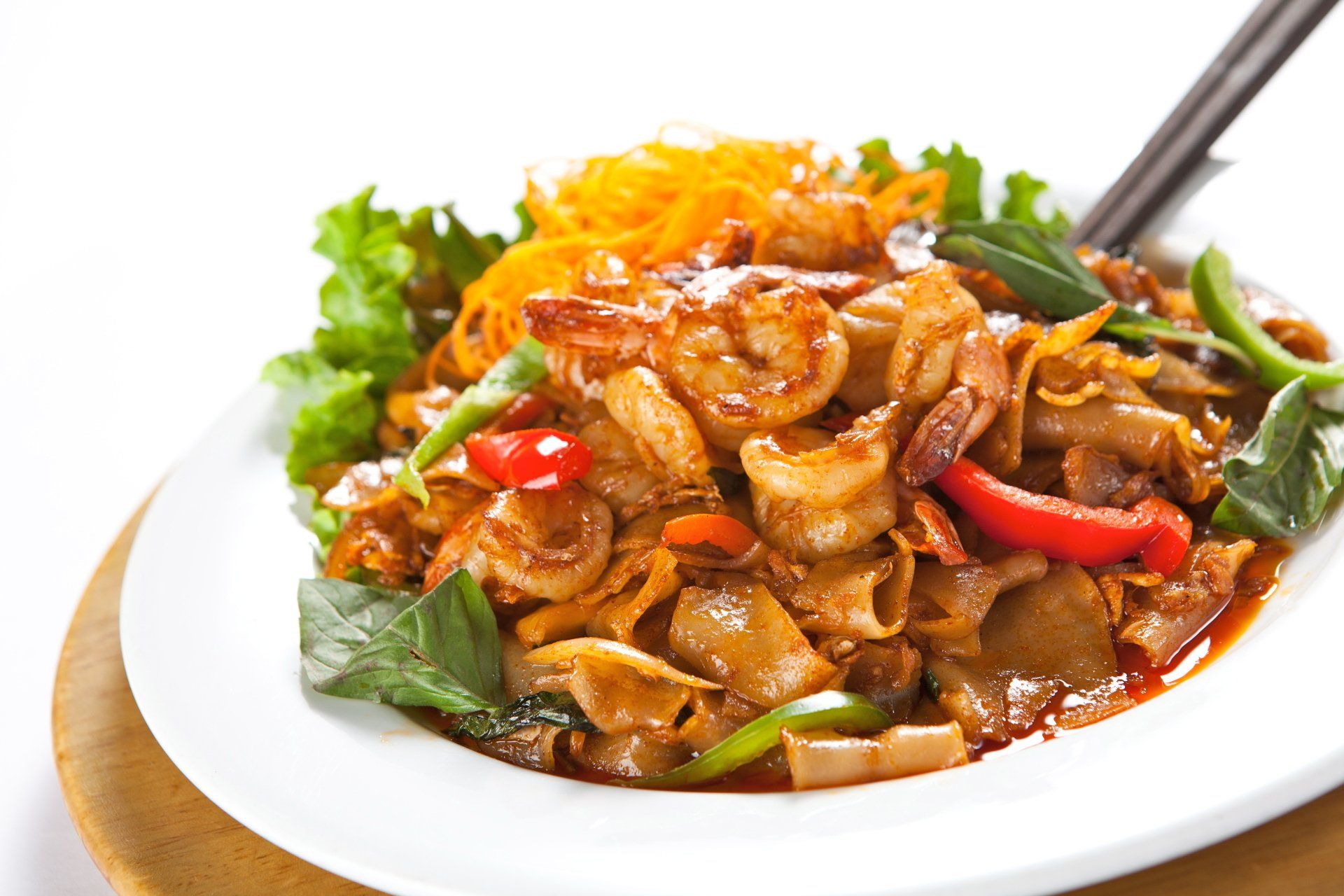 Wide rice noodles wok -tossed in light soy sauce and paprika with eggs, bell peppers, basil, tomatoes and onions