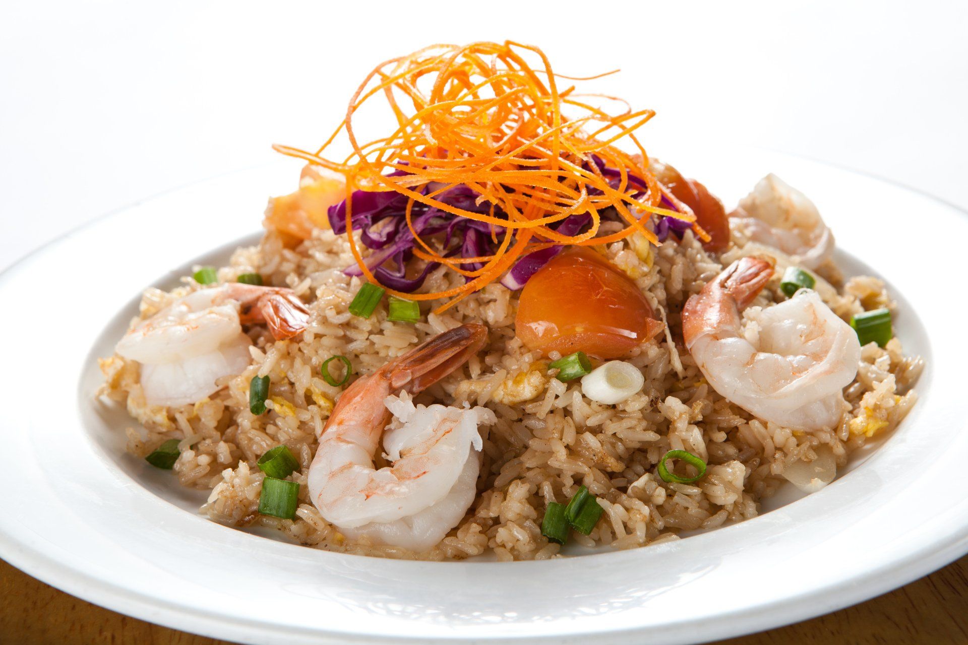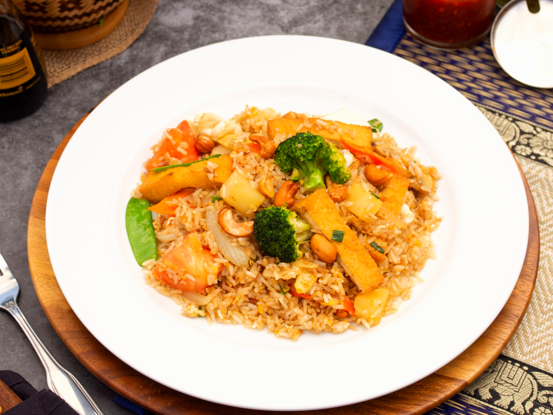 Hawaiian style with pineapples, eggs, cashews, onions, and tomatoes