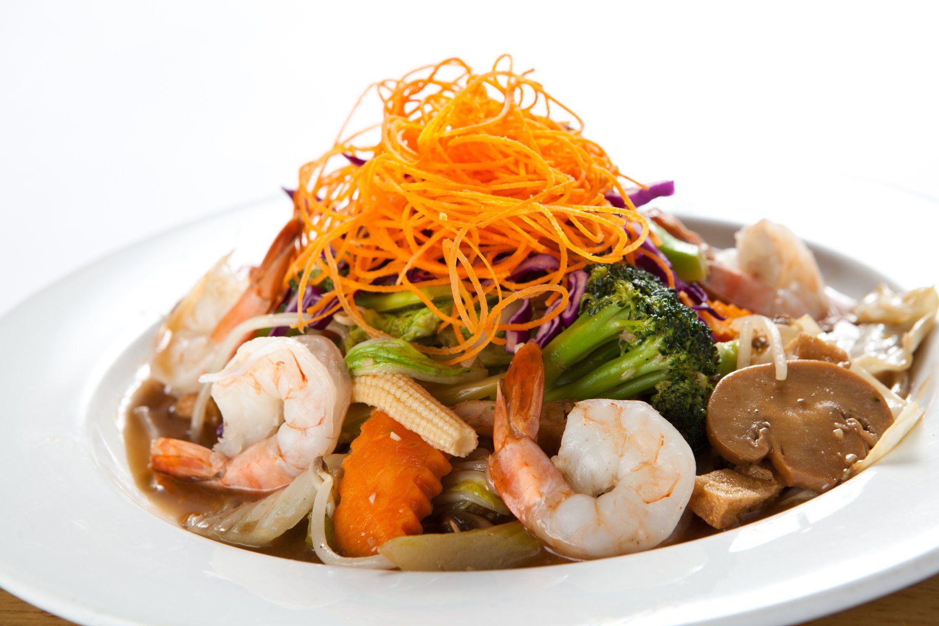 Cabbage, carrots, babycorns, mushrooms, bok- choy and tofu in clear chicken broth, garnished with scallion, cilantro and fried garlic.