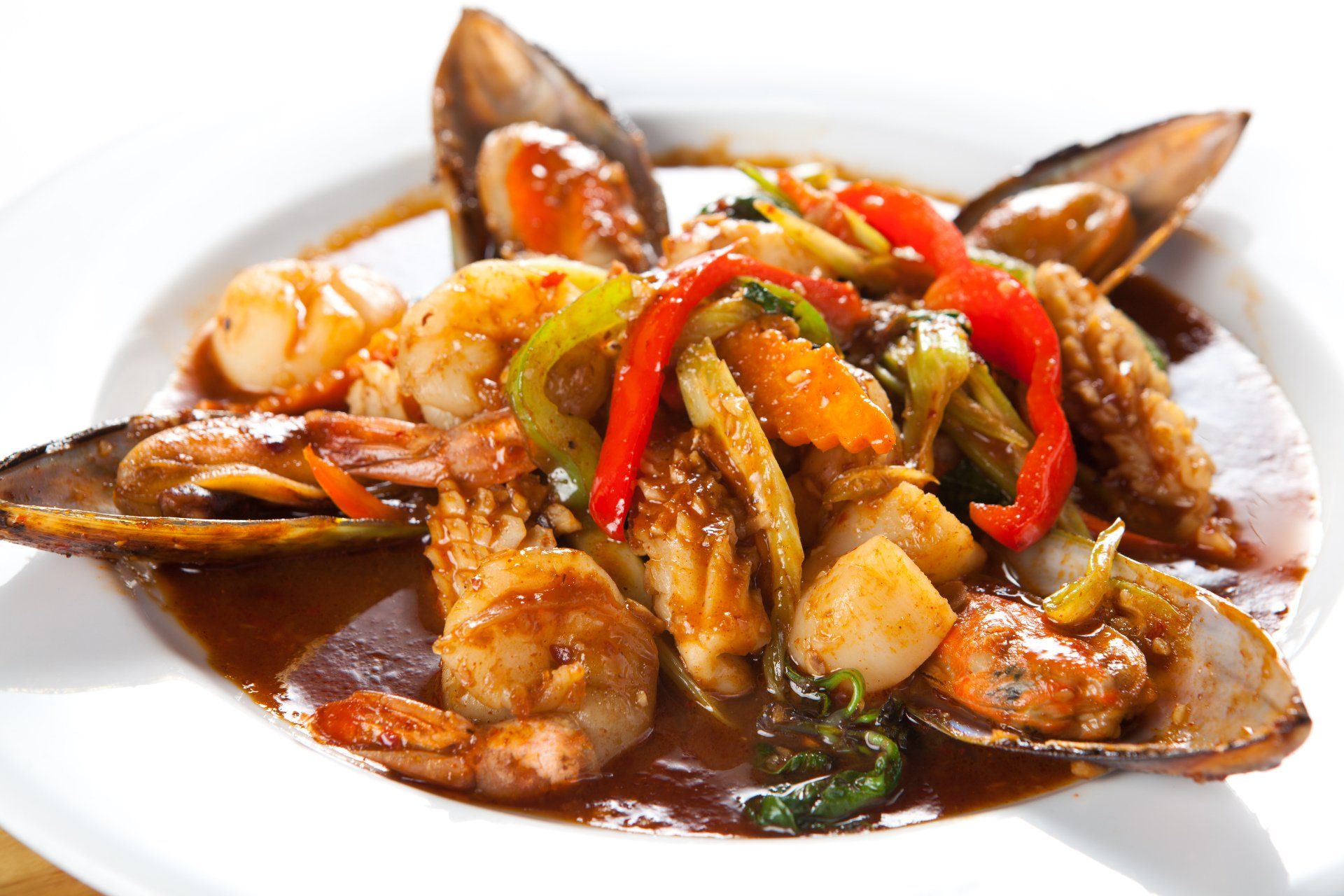 Shrimps, calamari, mussels, and scallops wok tossed with basil, celery, chilies and bell peppers.