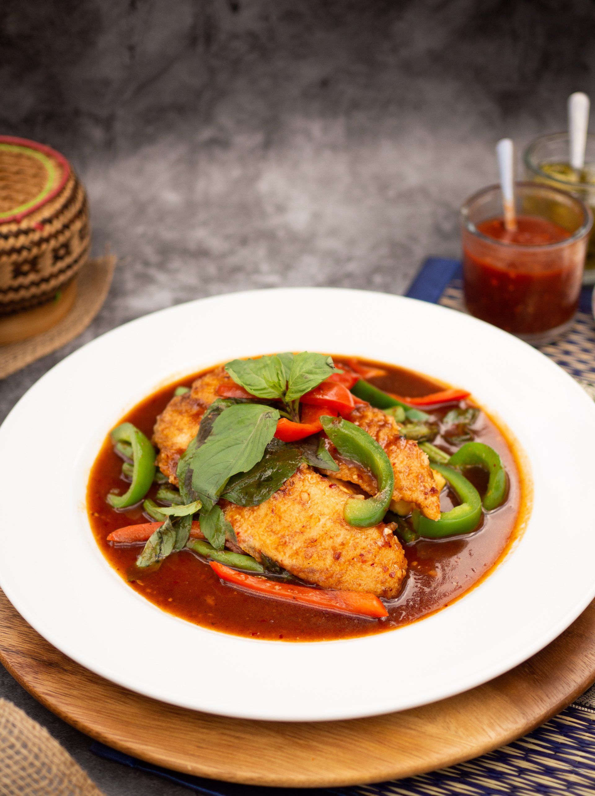Choice of sliced chicken breast, pork loin or tofu tossed in basil sauce with bell peppers and fresh basil